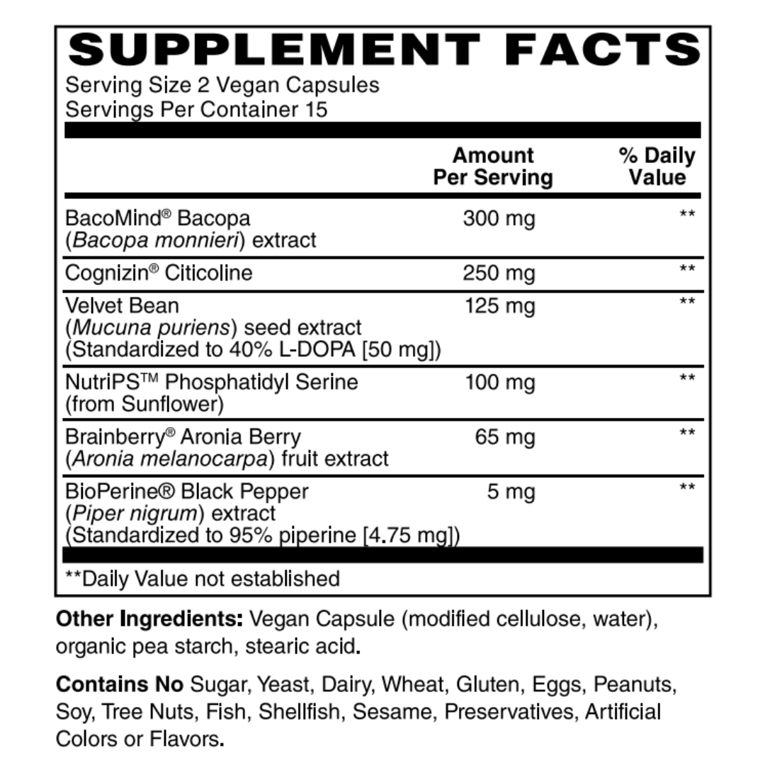 - 300 mg of BacoMind® Bacopa (Bacopa monnieri) Extract